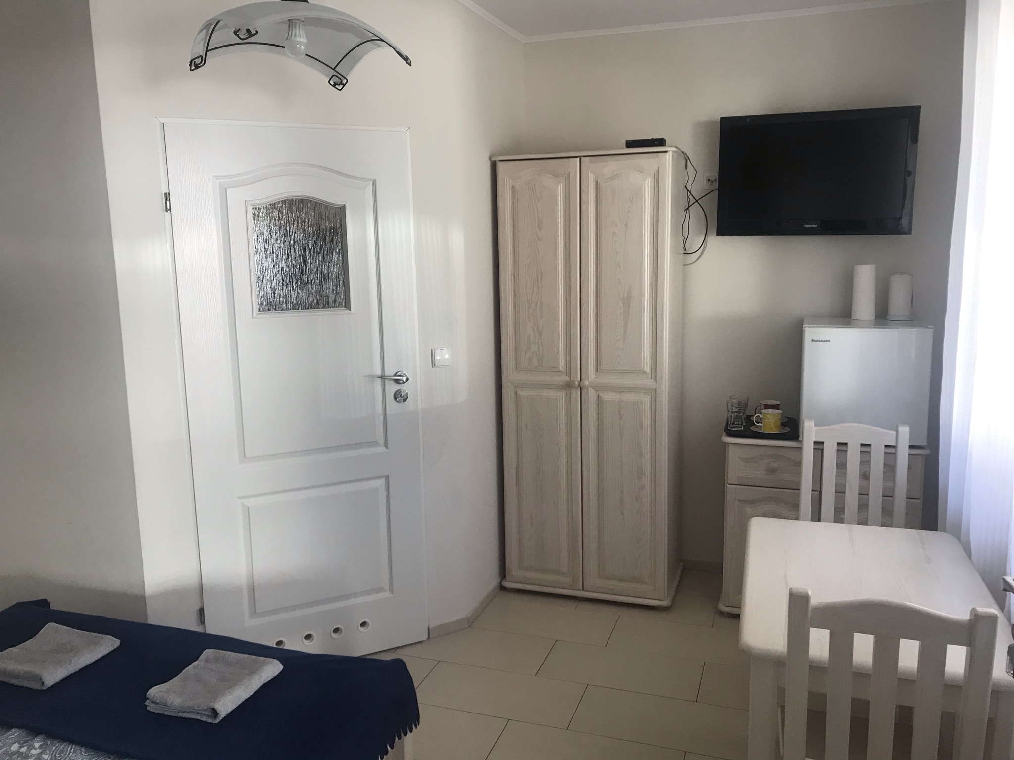 Wyposażony w łóżko podwójne, zestaw do parzenia kawy i herbaty, TV, lodówkę oraz łazienkę.